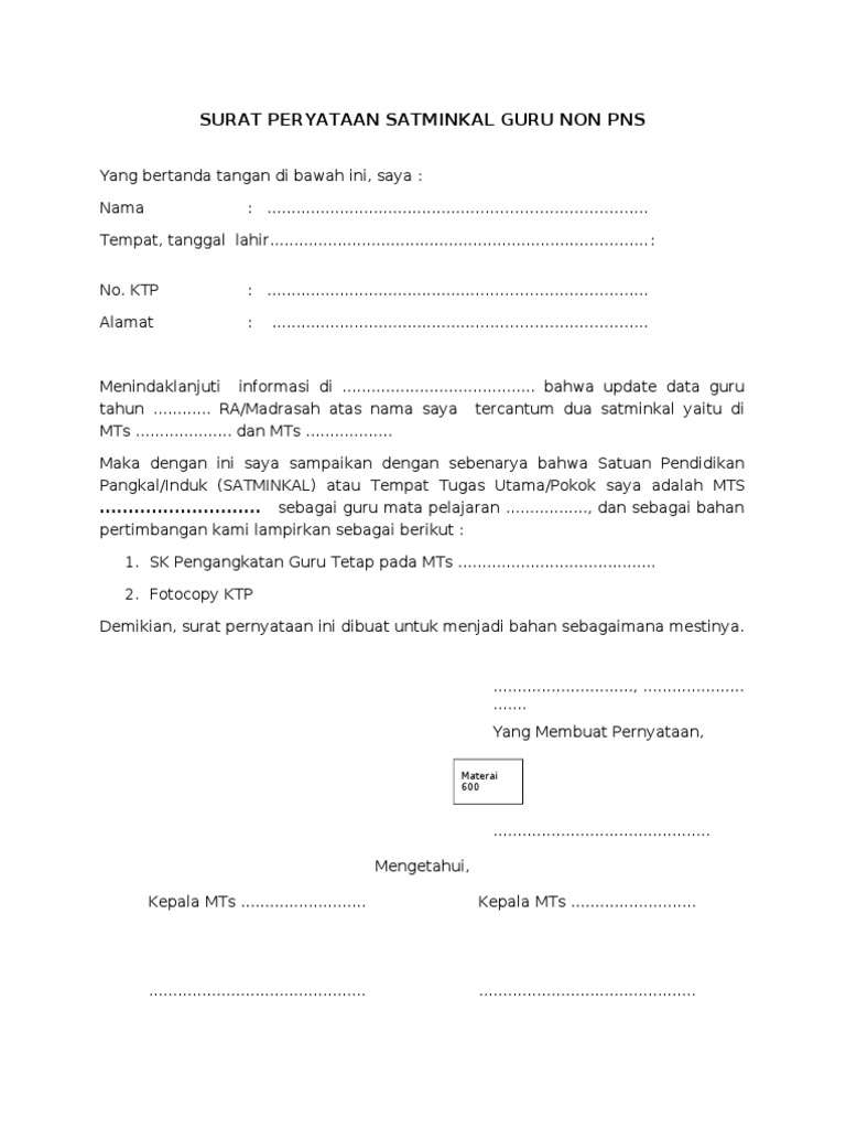 Pernyataan tertulis dari kepala sekolah bisa untuk guru ataupun siswa. 6 tahun 2018 tentang penugasan guru sebagai kepala sekolah pada pasal 21 huruf e kepala sekolah yang sedang. Telah mengajukan pindah ke salah satu sekolah dasar negeri …………… Program peningkatan kompetensi kepala sekolah merupakan kebijakan menteri pendidikan dan kebudayaan yang terencana dan berkelanjutan. Untuk tugas guru di berik kop sekolah, bagi pengawas diberi kop dinas pendidikan kabupaten/kota. Surat pernyataan kepala sekolah tentang kesiapan penyelenggaraan pembelajaran tatap muka di sekolah/madrasah menjadi salah satu persyaratan yang harus dipenuhi oleh satuan pendidikan baik sekolah/madrasah untuk dapat menyelenggarakan pembelajaran tatap muka di sekolah. Mematuhi tata tertib guru mengajar yang diberlakukan pihak sekolah. Surat ini ditujukan kepada kepala sekolah dan pengelola paud se kab. Nomor surat, identitas guru yang di masksud, keterangan mulai dan sampai kapan guru tersebut mengajar di sekolah induk tersebut, serta tanda tangan kepala. Menciptakan dan memelihara hubungan baik antara sesama guru, pegawai dan komite di lingkungan sekolah /kerja maupun dalam hubungan keseluruhan. Setelah sebelumnya admin membagikan contoh surat pernyataan penugasan dari kepala sekolah untuk guru yang menyatakan bahwa guru tersebut masih aktif. Terimakasih telah berkunjung di gawe cv pada post contoh surat pernyataan kepala sekolah. 0185.a/h.06/sma.01.04/mn/2010yang bertanda tangan di bawah ini:n a m a: