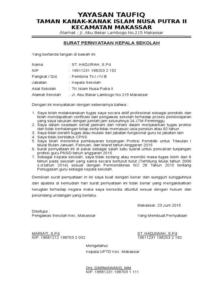 Jamade, m.si.n i p : Setelah sebelumnya admin membagikan contoh surat pernyataan penugasan dari kepala sekolah untuk guru yang menyatakan bahwa guru tersebut masih aktif. Program peningkatan kompetensi kepala sekolah merupakan kebijakan menteri pendidikan dan kebudayaan yang terencana dan berkelanjutan. Berikut ini adalah contoh surat pernyataan dari kepala sekolah benar melaksanakan tugas/beban mengajar 29 jam pelajaran tatap muka/minggu (daftar pembagian tugas. Surat pernyatan dari kepala sekolah biasanya dikeluarkan untuk guru yang menerima tunjangan sertifikasi.