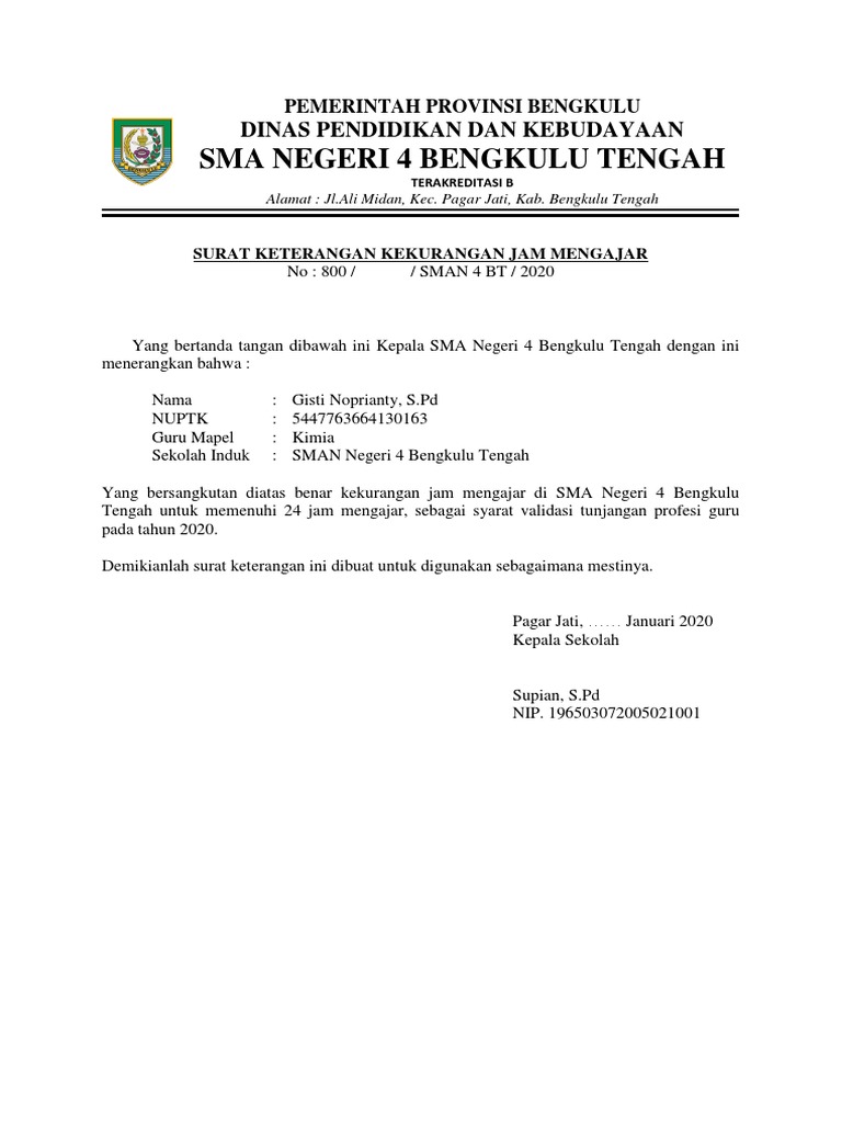 Semoga dapat memberikan manfaat yang berharga bagi. Surat keterangan mengajar 24 jam per minggu. Surat pernyataan kepala sekolah ihwal kesiapan penyelenggaraan pembelajaran tatap muka di sekolah/madrasah menjadi salah satu patokan yang mesti dipenuhi oleh satuan pendidikan baik sekolah/madrasah untuk sanggup menyelenggarakan pembelajaran tatap wajah di sekolah. 6 tahun 2018 tentang penugasan guru sebagai kepala sekolah pada pasal 21 huruf e kepala sekolah yang sedang. Kepala sma negeri 1 maniangpajomenyatakan dengan sebenarnya bahwa guru yang tersebut di bawah ini:n a m a: